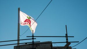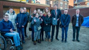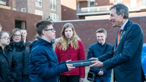 Met behulp van burgemeester Vos werden de vlaggen gehesen ter ere van het bereiken van het hoogste punt. Tevens werd de eerste dakpan uitgereikt.